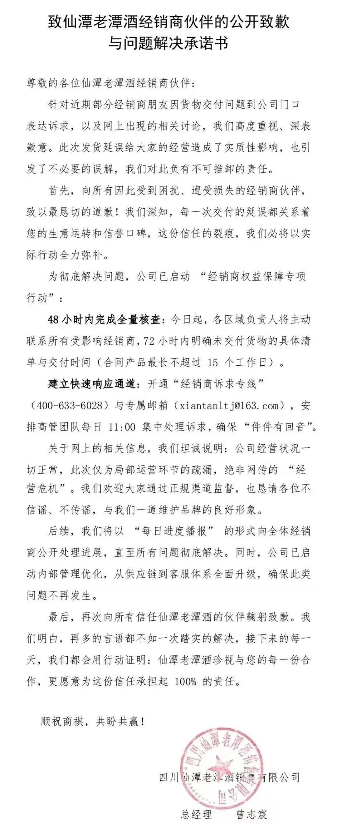 在冲突发生后,仙潭老潭酒就此发出道歉信,并承诺公司已启动“经销商权益保障专项行动”,48小时内完成全量核查:今日起,各区域负责人将主动联系所有受影响经销商,在72小时内明确未交付货物的具体清单与交付时间(合同产品最长不超过15个工作日)。同时,将建立快速响应通道,开通“经销商诉求专线”。