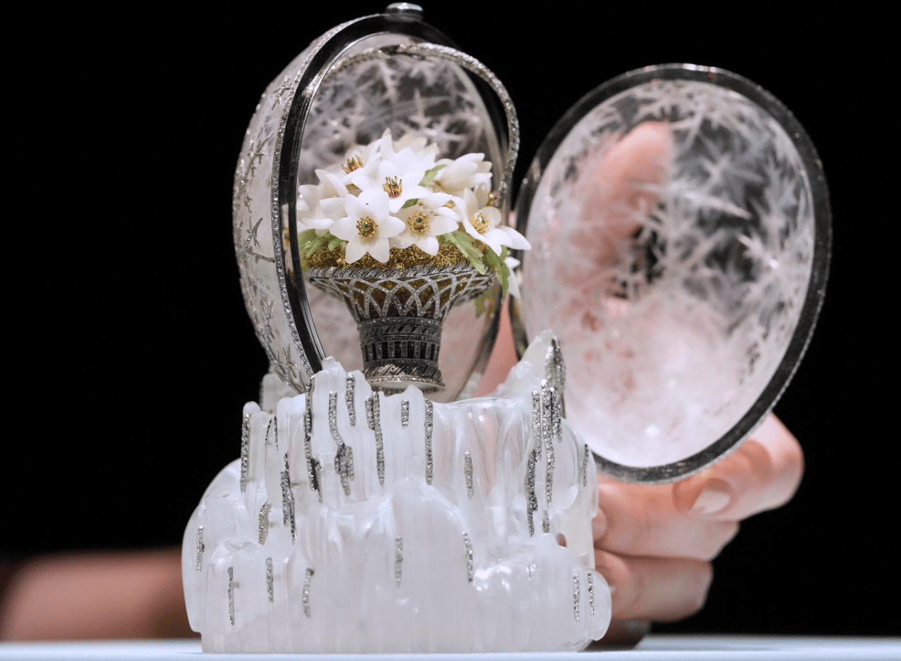 彩蛋主体由纯净的水晶石雕琢而成,铂金为底托,蛋壳表面镶嵌4500余颗玫瑰切工钻石,勾勒出精致的冰霜纹路,内部隐藏着以白石英、软玉和石榴石构造出的银莲花花篮。报道称,这件被誉为“技术与艺术上最具代表性的法贝热作品”出自珠宝师阿尔玛·皮尔之手,阿尔玛的创作灵感来源于工作台旁窗户上凝结的冰晶,她以精妙的工艺将这一幕用彩蛋完美呈现。