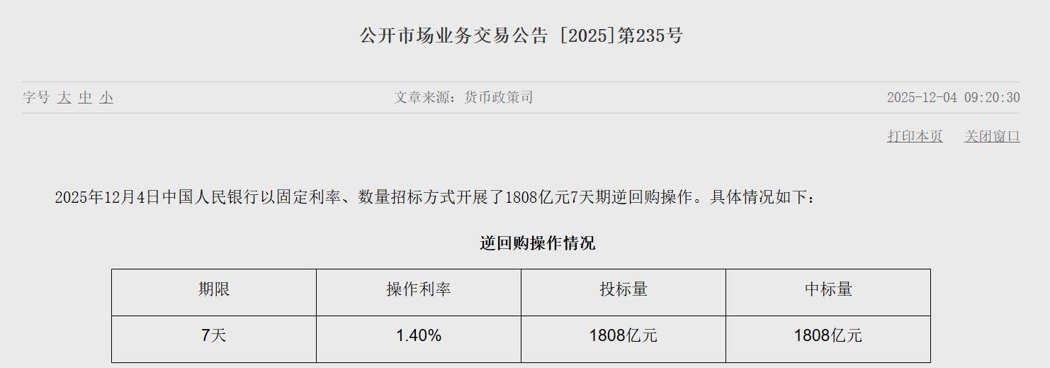12月4日,央行公告,为保持银行体系流动性充裕,2025年12月5日,中国人民银行将以固定数量、利率招标、多重价位中标方式开展10000亿元买断式逆回购操作,期限为3个月(91天)。
