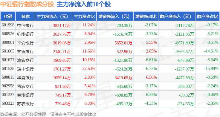 资金流向方面,中证银行(399986)指数成份股当日主力资金净流出合计12.25亿元,游资资金净流入合计7.87亿元,散户资金净流入合计4.38亿元。成份股资金流向详情见下表: