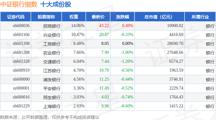 证券之星消息,12月4日,中证银行(399986)指数报收于7702.3点,跌0.42%,成交208.12亿元,换手率0.22%。当日该指数成份股中,上涨的有4家,瑞丰银行以0.89%的涨幅领涨,下跌的有35家,厦门银行以1.85%的跌幅领跌。