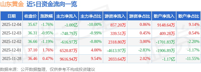 证券之星消息,截至2025年12月4日收盘,山东黄金(600547)报收于35.67元,下跌1.76%,换手率0.77%,成交量27.68万手,成交额10.01亿元。