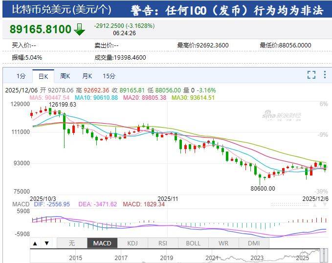 比特币再次跌穿9万美元关口。截至发稿报89165.81美元,跌幅3.16%。