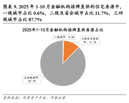 地域分布高度集中于低能级城市。2025年1-10月挂牌房源中,一线城市占比仅0.6%,二线及省会城市占比11.7%,三四线城市占比高达87.7%。