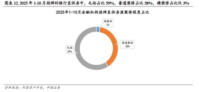 研报指出,银行直供房的供应量有限,同时区域分布高度集中在三四线城市,此外房源精装修比例极低,整体成交情况也非常低迷。