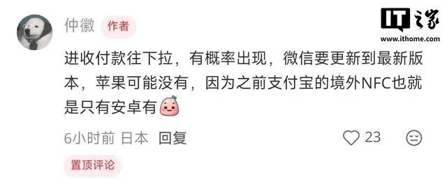 12 月 6 日消息,小红书用户 @仲徽 今天透露,微信正在测试境外 NFC 支付功能。