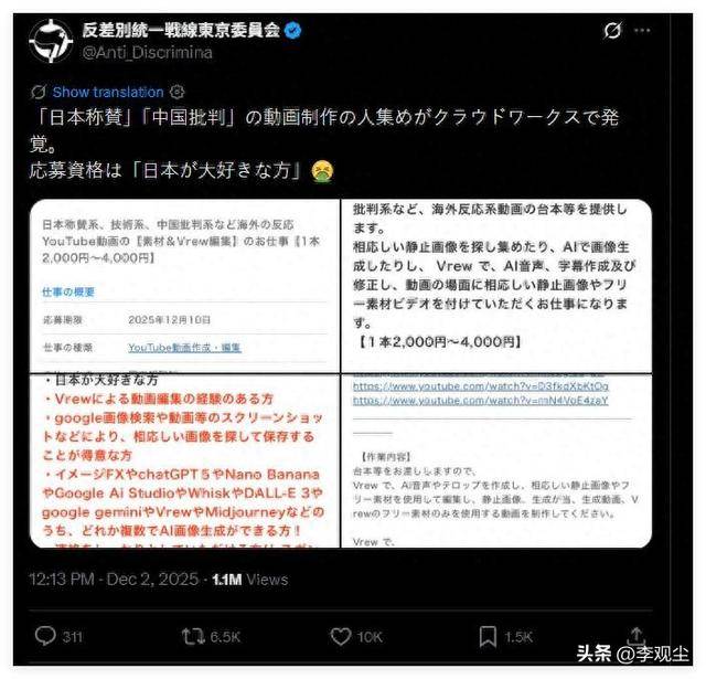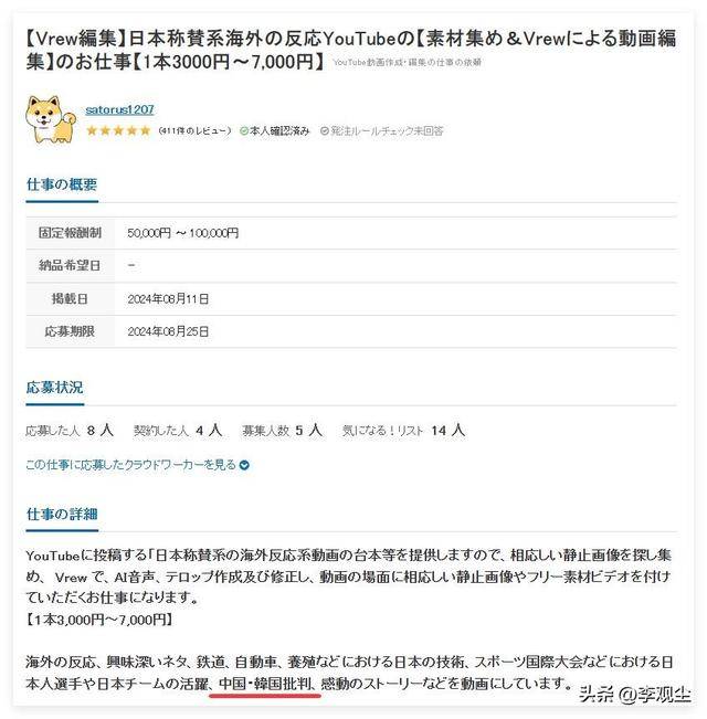 这种将抹黑他国、吹捧本国作为明确工作内容的公开招募,在国际舆论场中实属罕见,刚一曝光就遭到日本本土网民的集体批判。