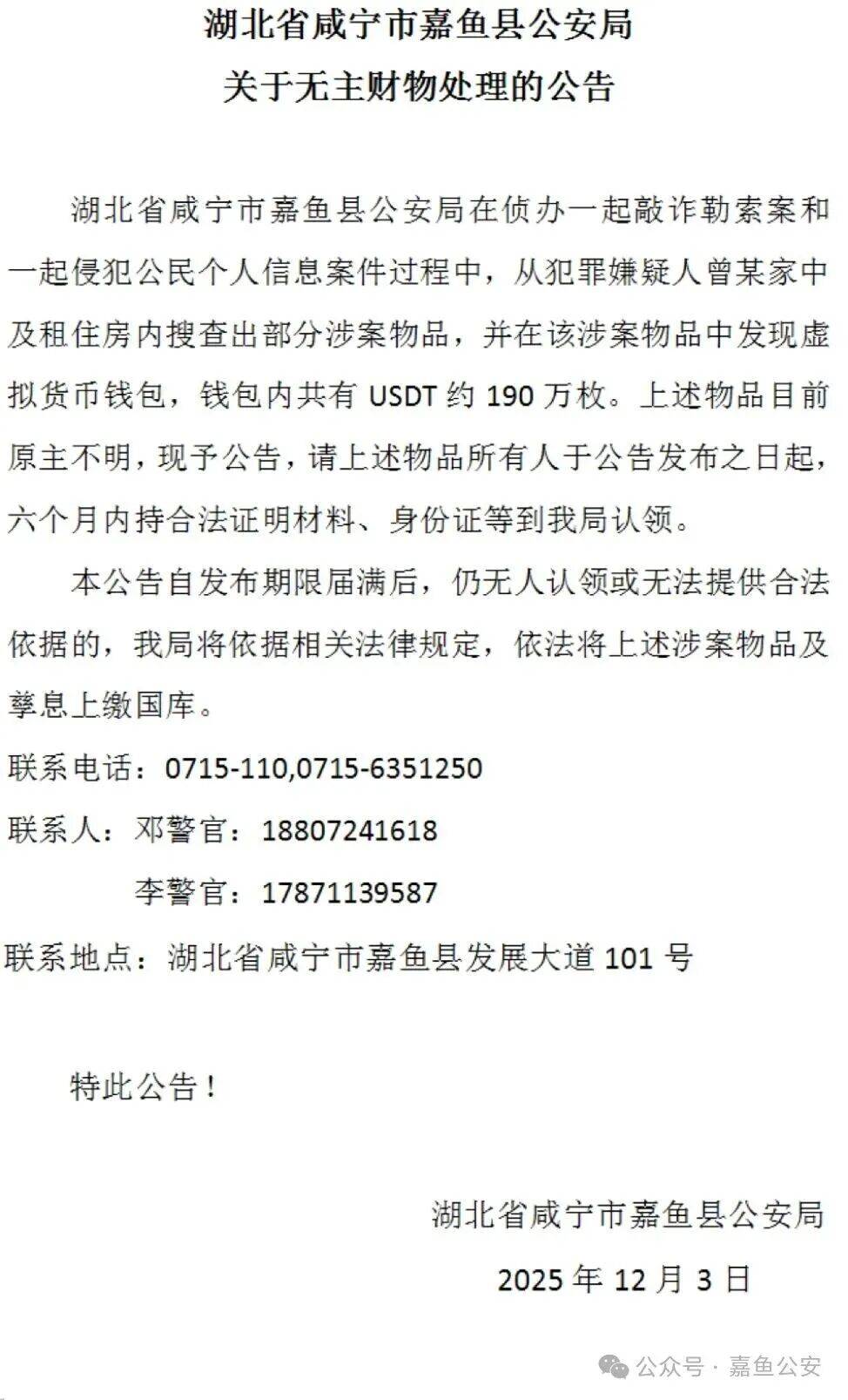 湖北省咸宁市嘉鱼县公安局在侦办一起敲诈勒索案和起侵犯公民个人信息案件过程中,从犯罪嫌疑人曾某家中及租住房内搜查出部分涉案物品,并在该涉案物品中发现虚拟货币钱包,钱包内共有USDT约190万枚。
