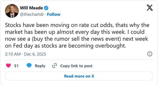 eToro美国投资分析师布雷特・肯韦尔(Bret Kenwell)也表示,“我认为关键在于美联储对2026年经济和政策前景的预测,这将决定市场月底能否迎来‘圣诞老人行情’。我们将能清晰了解美联储的立场及其对明年的预期,这将定下市场基调。”