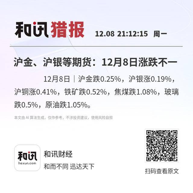 12月8日|沪金跌0.25%,沪银涨0.19%,沪铜涨0.41%,铁矿跌0.52%,焦煤跌1.08%,玻璃跌0.5%,原油跌1.05%。