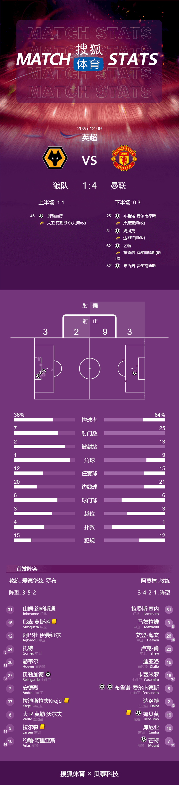 北京时间12月9日凌晨,2025/2026赛季英超联赛第15轮继续进行,狼队坐镇主场对阵曼联。上半场,库尼亚助攻B费破门,狼队由贝莱佳德扳平比分。下半场,姆贝莫、B费和芒特先后进球,最终曼联客场4-1击败狼队,升至积分榜第六位。