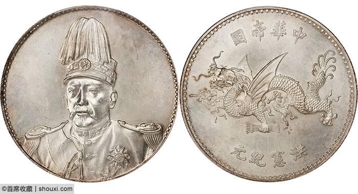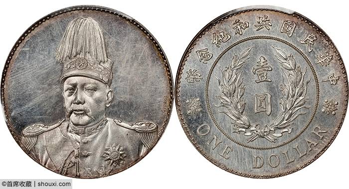 袁世凯像共和纪念壹圆,PCGS-AU,浅橙包浆,鼻尖磨损,估价7000-10000美元;袁世凯像共和纪念壹圆,PCGS-AU,灰色包浆,些许痕迹,估价7000-10000美元;袁世凯像共和纪念壹圆签字,PCGS-SP63,铸压有力,边缘金棕包浆,底光充盈,估价10万-15万美元;袁世凯像洪宪飞龙纪念,PCGS-MS63,浅灰包浆,光泽盈亮,鼻尖少许磨损,估价5万-8万美元。