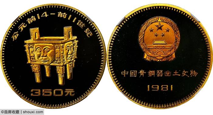1998-2009年观音纪念一组12枚,估价6500-8500美元;连续2枚1978年中国出土文物展览纪念金章1.5盎司,NGC-MS64,图文立体,估价6000-7000美元;1979年建国30周年纪念金币1/2盎司全套4枚,估价7000-10000美元;1981年中国青铜器出土文物方鼎人面纹黄铜样币,NGC-PF69,镜面底板,图案浮雕感强烈,估价1.5万-2万美元;1981年中国青铜器出土文物方鼎人面纹黄铜样币,NGC-PF69,底板镜面,图案立体,估价1.5万-2万美元。
