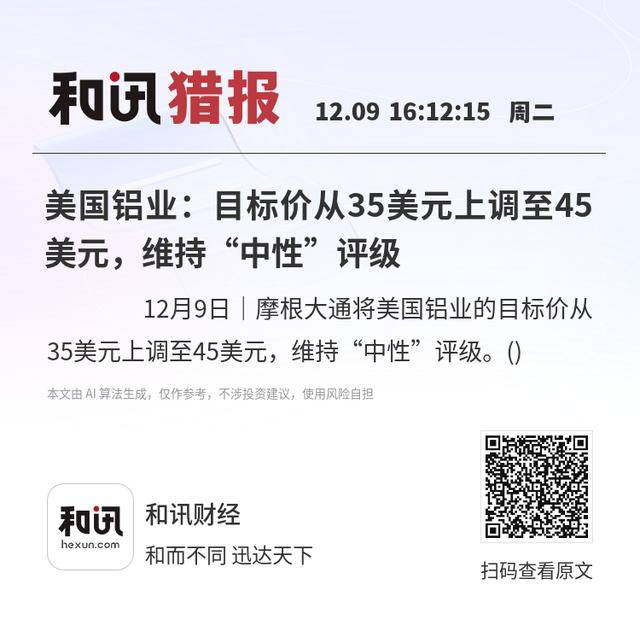 12月9日|摩根大通将美国铝业的目标价从35美元上调至45美元,维持“中性”评级。