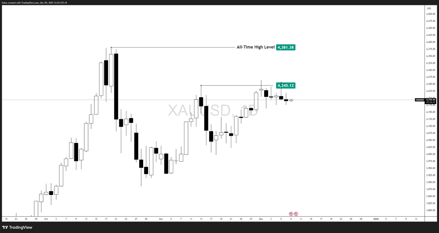 金价在4,245美元阻力位下方整理,形成紧凑格局,预示潜在突破前的价格压缩。