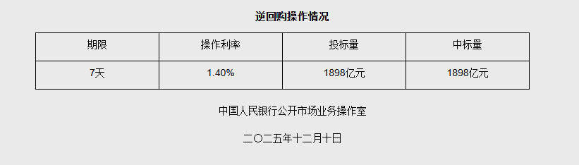 中新网12月10日电 据央行网站消息,2025年12月10日中国人民银行以固定利率、数量招标方式开展了1898亿元7天期逆回购操作。具体情况如下: