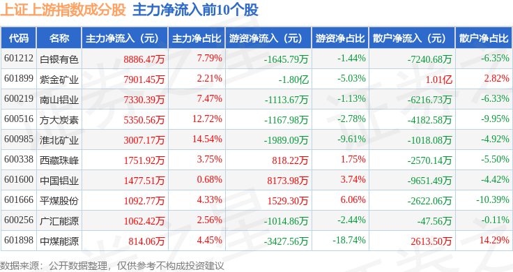 资金流向方面,上证上游(000094)指数成份股当日主力资金净流出合计17.23亿元,游资资金净流入合计5.32亿元,散户资金净流入合计11.91亿元。成份股资金流向详情见下表: