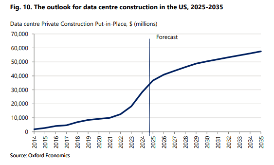 2025年,北美、西欧以及东亚和东南亚的数据中心占全球计算容量的88%。美国单独就占超过22.57吉瓦的IT功率容量。牛津经济研究院预测,未来10年美国数据中心建设将增长57%。