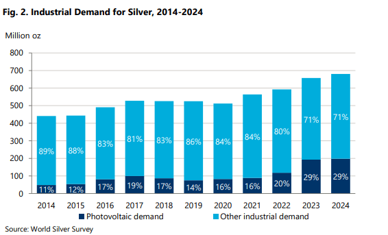 进一步来看,人工智能应用越来越依赖专业硬件,如图形处理单元(GPU)、张量处理单元(TPU)和神经处理单元(NPU),这些都依赖于在内部连接和封装中使用白银的高性能半导体。2024年工业白银需求达到创纪录的6.805亿盎司,这主要由人工智能相关应用在消费电子和硬件中的电子电气需求推动。