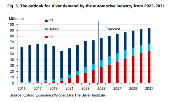 预测显示,汽车行业的全球白银需求将在2025-2031年间以3.4%的复合年增长率增长,到2031年达到约9400万盎司。2024年燃油车占白银需求的55%,电动汽车占30%。由于电动汽车需求和产量快速增长,预计到2027年电动汽车将超越燃油车成为汽车行业白银需求的主要来源,到2031年将占59%的份额。