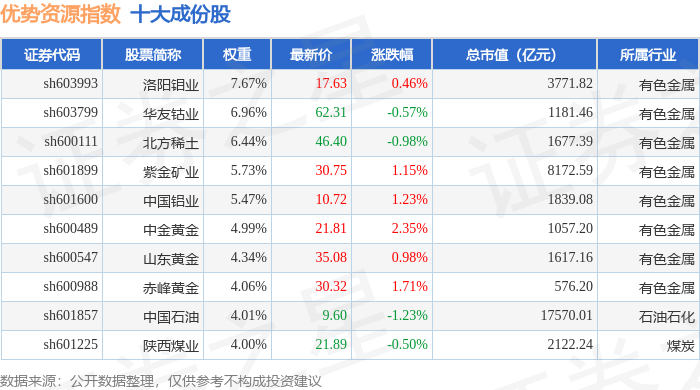 证券之星消息,12月10日,优势资源(000145)指数报收于7676.47点,涨0.43%,成交351.49亿元,换手率0.59%。当日该指数成份股中,上涨的有28家,白银有色以4.43%的涨幅领涨,下跌的有11家,合盛硅业以3.12%的跌幅领跌。