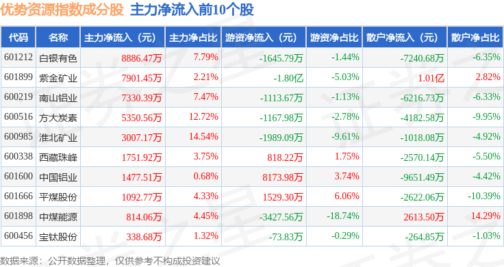 资金流向方面,优势资源(000145)指数成份股当日主力资金净流出合计15.74亿元,游资资金净流入合计4.37亿元,散户资金净流入合计11.37亿元。成份股资金流向详情见下表: