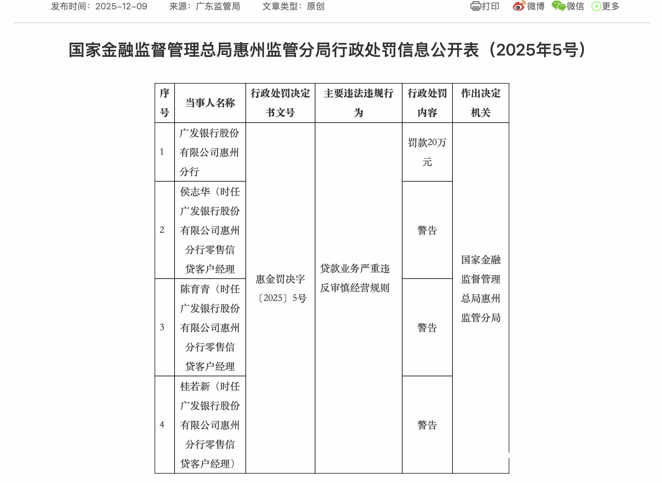 据惠银罚决字〔2025〕5号,因贷款业务严重违反审慎经营规则,国家金融监督管理总局惠州监管分局对广发银行股份有限公司惠州分行处以罚款20万元,对时任广发银行股份有限公司惠州分行零售信贷客户经理的侯志华、陈育青、桂若新处以警告。