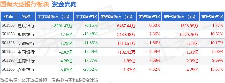 从资金流向上来看,当日国有大型银行板块主力资金净流出15.21亿元,游资资金净流入5.02亿元,散户资金净流入10.19亿元。国有大型银行板块个股资金流向见下表: