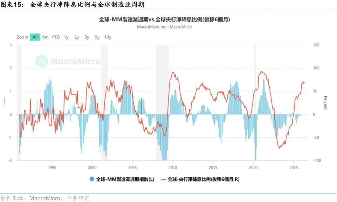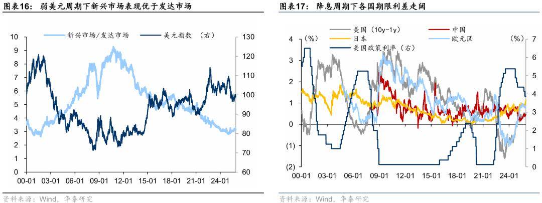 3)全球降息周期已进入收尾阶段,对大类资产的影响或逐步从分母端的估值抬升转移到分子端的盈利改善,并带来几个配置思路的变化。第一,制造业周期有望企稳回升,历史上看全球央行净降息比例领先全球制造业周期大约6个月时间,前者已回升至相对高位;第二,新兴市场股票弹性或优于发达市场,分子端受益于制造业占比更高,分母端受益于美元走弱与离岸美元流动性宽松;第三,铜等工业品的优先级或高于黄金,供给稀缺工业商品在制造业回暖与财政扩张周期中更加受益,而明年宏观环境(尤其估值端)对黄金的友好度有所降低。第四,短端债券整体优于长端,经济企稳后通胀压力或边际回升,收益率曲线陡峭化趋势或延续。