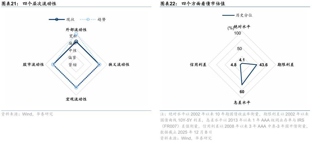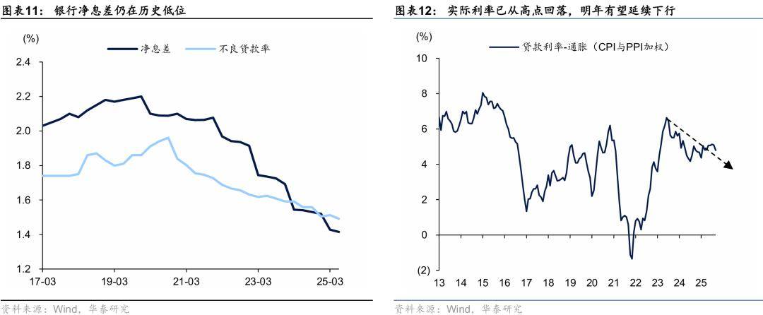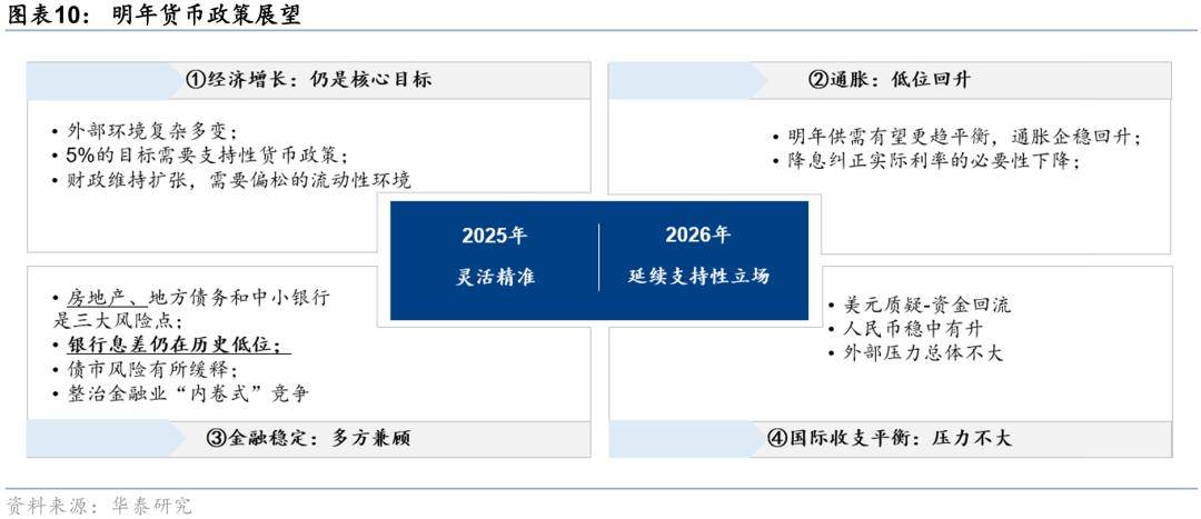 第四,国内货币政策延续支持性立场,政治局会议保留了“适度宽松”的货币政策定调,不过整体政策基调上更重视“质”和“效”,存量重于增量,重提“跨周期”着眼长期。当下降息制约因素在于:1)明年关税不确定性下降,外需预计保持动能;2)银行息差还在历史低位;3)银行负债端稳定性大幅下降;4)降息不利于理财等居民财产性收入;5)明年通胀缺口有望回正、纠正实际利率的必要性降低。可能支撑降息的理由:1)稳增长、稳就业仍是货币政策的核心目标,5%的经济增长目标需要支持性货币政策;2)人民币升值后,外部约束缓解;3)房地产市场仍需结构性降息提振;4)欧洲等经贸存在不确定性。综合来看,明年初有降准可能,而全局性降息需要较大的外部冲击或地产、内需超预期弱化作为触发剂。