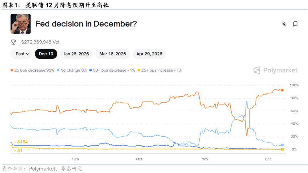 第一,美联储12月更有可能鹰派降息,叠加一系列关键经济数据即将发布,后续利率路径不确定性上升,投资者短期或采取谨慎观望态度。11月以来,市场对联储12月FOMC的预期一度大幅波动,不过在纽约联储主席威廉姆斯释放鸽派信号后,市场逐渐坚定了降息的信心。截至12月7日,Polymarket定价12月降息概率为93%。但未来经济仍有不确定性,就业市场缺乏明确方向性,且在10月数据缺失,11月重要经济数据在FOMC会后公布的情况下,美联储缺乏数据支撑,对未来指引或更加谨慎,甚至偏向鹰派,而明年的降息路径或仍是根据数据相机决策。