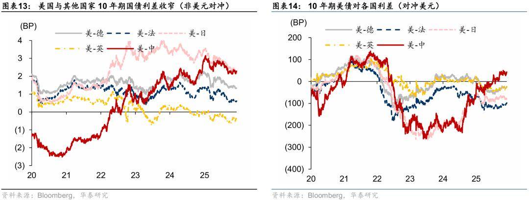 2)如果各国央行货币政策的分化持续,或进一步引发全球资金的再平衡。从利差的角度看,自今年9月美联储重启降息以来,美国对其他国家10年国债利率持续收窄,而进行外汇对冲后,10年美债实际收益率低于多数国家。考虑到美联储后续降息空间高于欧洲、日本(加息)、中国等主要经济体,利差仍有收窄趋势,美元指数或偏弱运行,并带动资金回流非美市场。