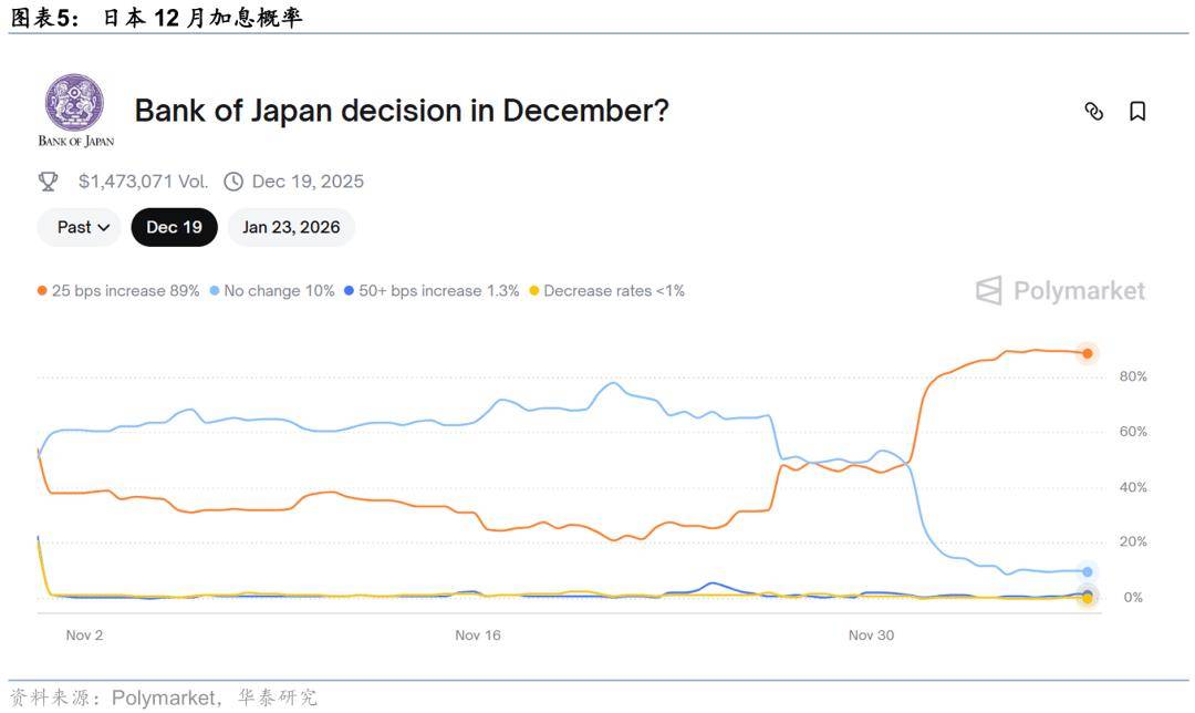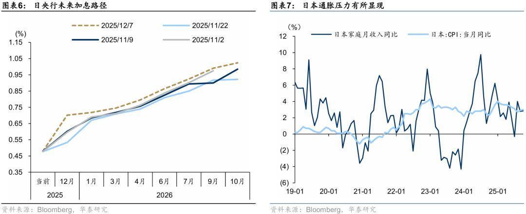第二,日央行12月加息25bp则成为基准情形,但表述偏鸽的概率较高;后续展望,日央行仍面临通胀上行(薪资)、增长动能有限、配合财政需要、日元和日债市场调整等多重压力下的权衡取舍,持续性加息的概率或不大。近期日本央行行长植田和男的鹰派表态大幅提升了12月加息预期,Polymarket显示加息25bp的概率近90%,其中部分或来自稳汇率的诉求以及对明年薪资谈判的乐观预期。不过植田和男也表态,利率上调仅是对宽松程度的调整,整体货币政策仍将维持宽松状态,而非转向紧缩,且释放出配合政府的意愿。预计明年更多是“小步快跑”,持续加息的概率不强,OIS市场预计明年或再加息一次。核心变量在于“工资-通胀”螺旋是否强化,重点关注明年一季度春斗数据。