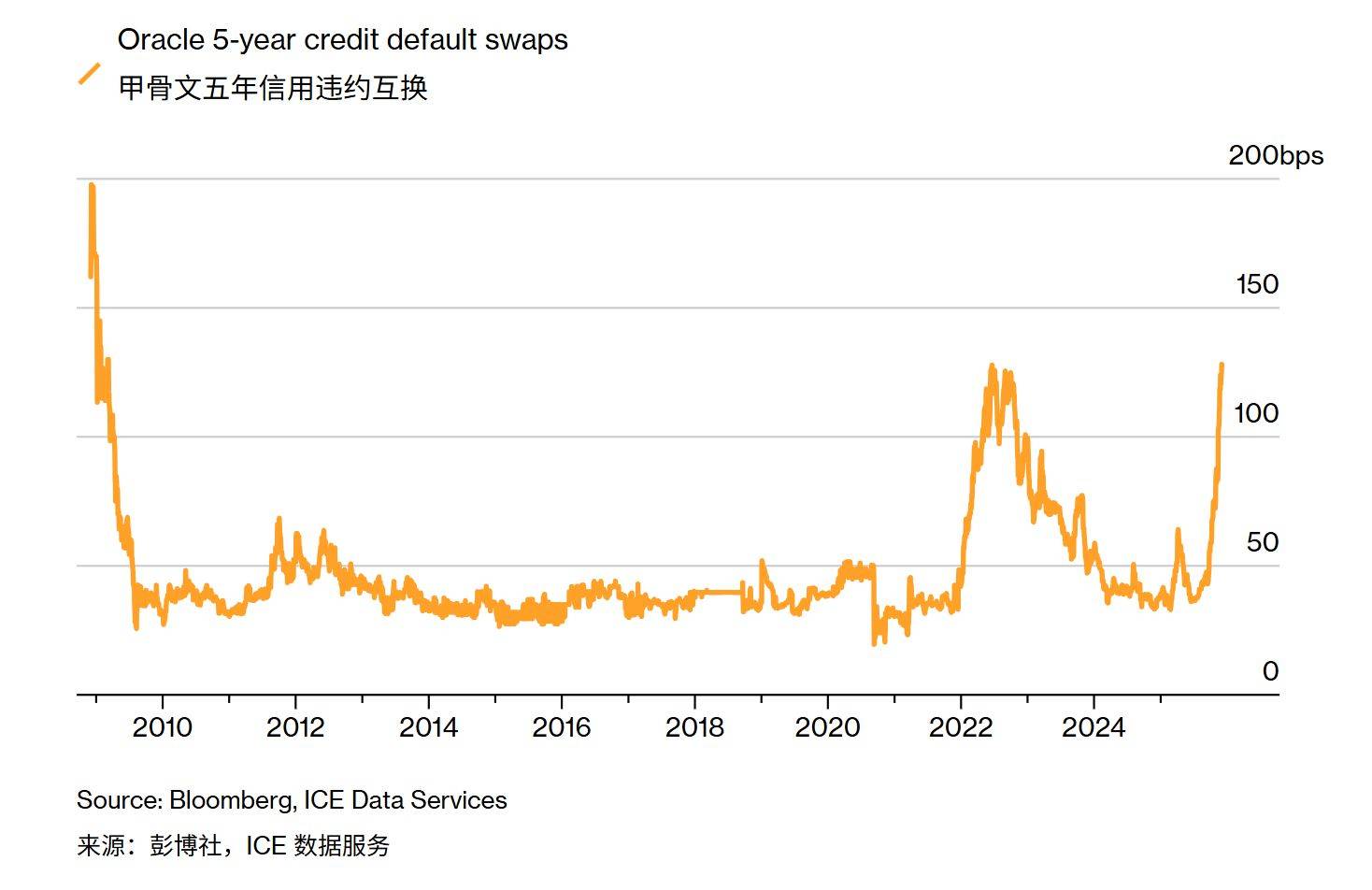 更值得警惕的是,反映其信用风险的五年期信用违约掉期(CDS)已攀升至2009年以来的最高水平。截至12月5日的十周内,甲骨文CDS交易量飙升至约92亿美元,而去年同期仅为4.1亿美元。