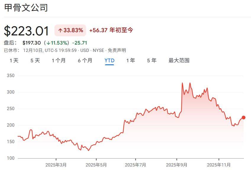 12月11日,截至发稿,甲骨文股价盘前大跌超12%。年初至今,甲骨文股价虽然仍上涨35%,但相较9月高点已跌去约31%。彼时,甲骨文宣布合同积压规模激增至4550亿美元,这一消息推动股价大涨,并一度让联合创始人拉里·埃里森成为全球首富。
