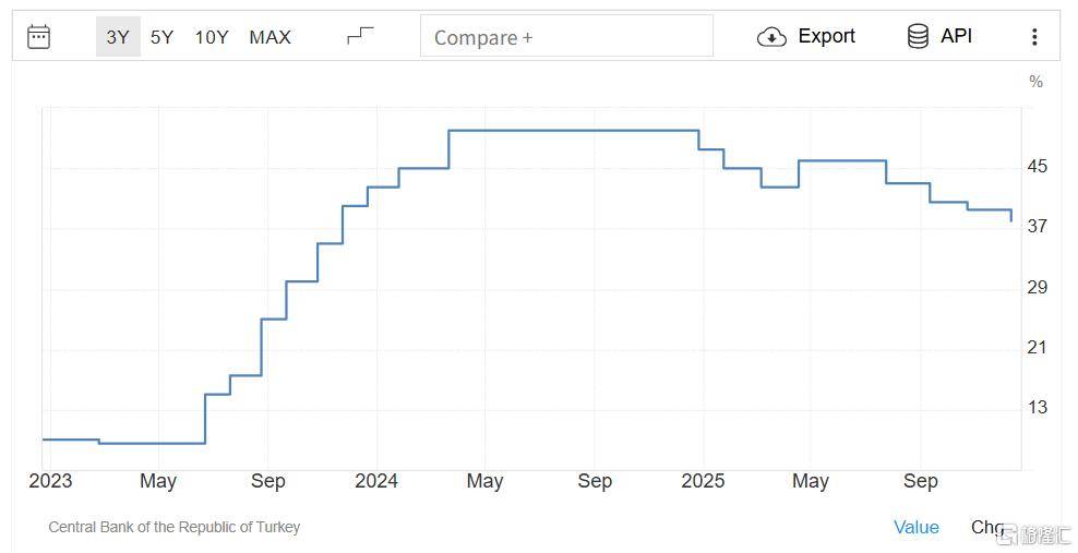 住的注意的是,这是土耳其央行连续第四次降息。今年7月,土耳其央行重启降息,将政策利率下调300个基点至43%。今年9月,土耳其央行超预期降息250个基点,将政策利率调整至40.5%。今年10月,土耳其再度降息100个基点,政策利率降至39.5%。