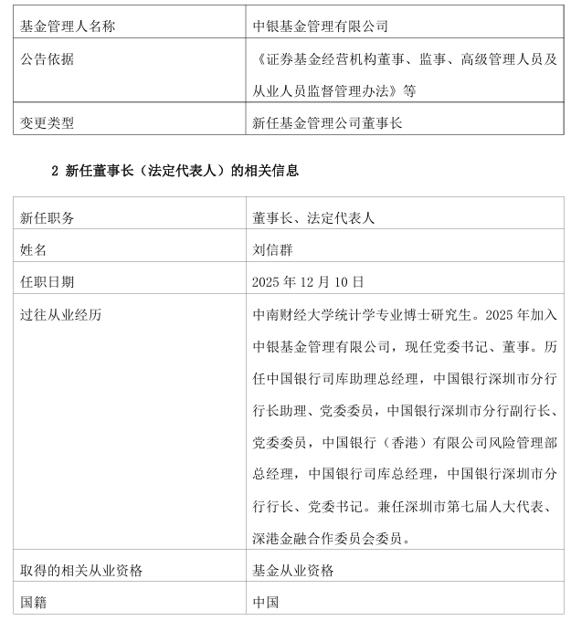 【大河财立方消息】12月11日,中银基金管理有限公司发布关于董事长(法定代表人)变更的公告,刘信群担任公司董事长。