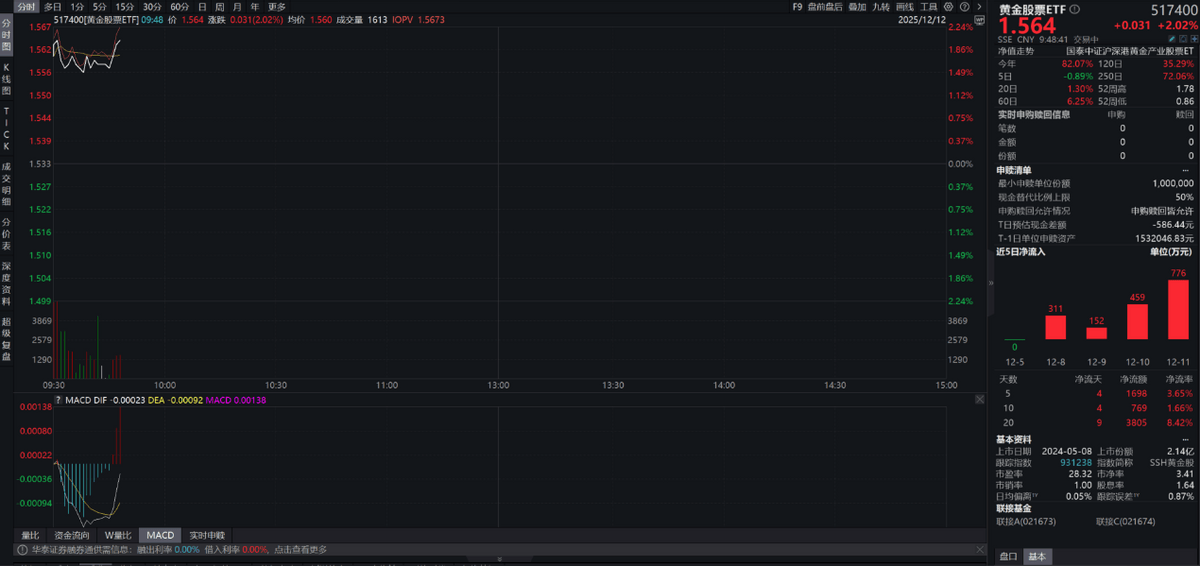 在美联储年内第三次降息如期落地后,金价持续走高,跟踪黄金股板块的黄金股票ETF(517400)盘中涨超2%,连续4日迎资金净流入。