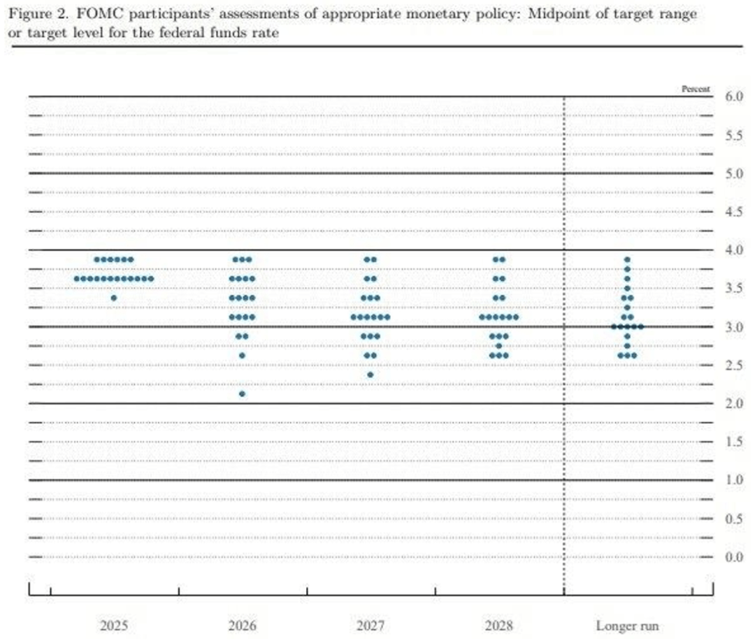 美联储降息如期落地。当地时间12月10日,美联储宣布降息25个基点,将联邦基金利率目标区间下调至3.50%~3.75%,这是继9月17日,10月29日之后的年内第三次降息,幅度均为25个基点。本次降息落地前市场已经有充分预期,关注点更多在于美联储对后续降息路径的态度。点阵图中位数维持了2026年仅有1次降息的预测,鲍威尔也表示当前利率处于“有利位置”,表明后续降息门槛可能提高。