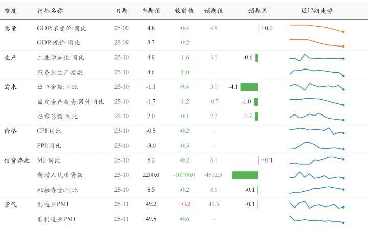 2025年10月,宏观经济在假期效应叠加基数普遍开始走高的背景下增速放缓,供需两端均转弱,生产、投资、外贸、社融、信贷增速普遍低于市场预期,而服务业与物价表现略超市场预期。从11月以来的高频数据表现看,工业生产整体较10月进一步降温,内需整体依旧偏弱,外需较10月改善,新旧动能分化依旧明显,但温差收窄,物价压力预计将延续缓和。