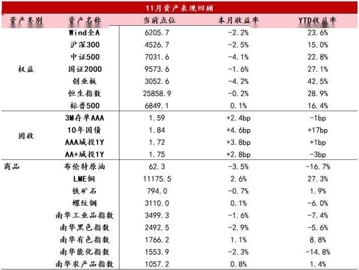 11月,受关键数据真空影响,美联储降息预期生变,投资者对当前AI资产是否出现泡沫、科技叙事持续性的担忧阶段性升温,全球风险资产以下跌为主;国内方面,中日关系恶化、经济基本面分化,在外部降息预期波动的背景下,权益资产震荡调整。全月来看,万得全A录得-2.22%;小盘风格占优,万得微盘股指数涨幅4.97%,成长风格跌幅较大,科创50跌幅6.24%,创业板跌幅4.23%。行业上,六成申万一级行业录得负收益,其中计算机、汽车、电子跌幅较大,综合、纺织服装、银行、石油石化表现靠前。港股市场受降息预期影响,恒生科技调整幅度较大(全月-5.23%),恒生指数相对强势(全月-0.18%);南向资金单月净买入约1116亿元;AH溢价小幅回升至121附近。
