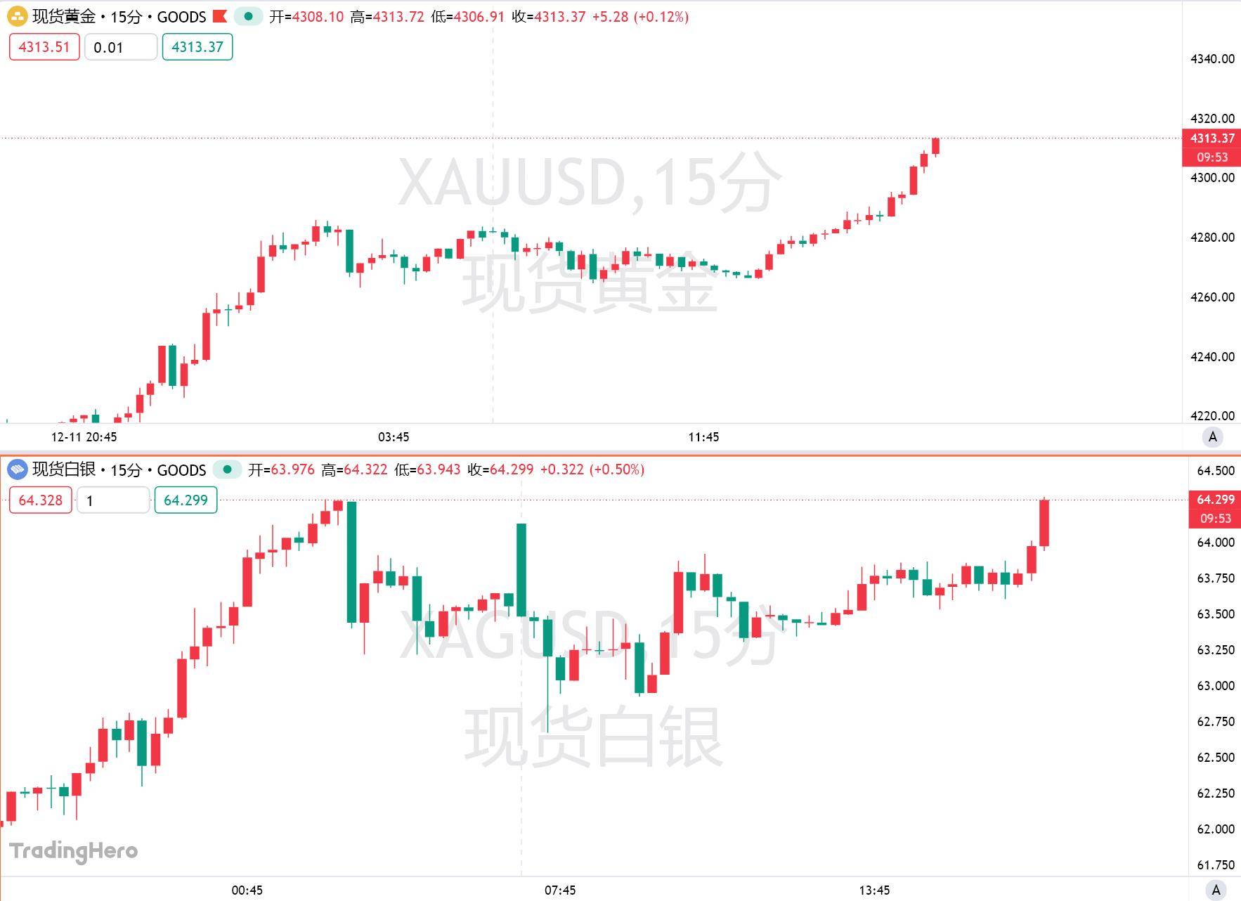 周五,由于市场预计本周美联储降息后仍将进一步宽松货币政策,现货黄金在连续第四个交易日走高,欧盘站上4310美元/盎司关口,为10月21日以来首次,日内涨超0.7%。现货白银交易价格接近历史高位,日内涨超1%。