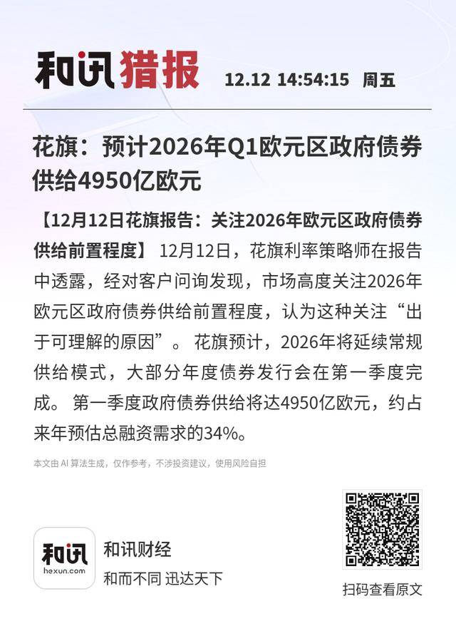 【12月12日花旗报告:关注2026年欧元区政府债券供给前置程度】12月12日,花旗利率策略师在报告中透露,经对客户问询发现,市场高度关注2026年欧元区政府债券供给前置程度,认为这种关注“出于可理解的原因”。 花旗预计,2026年将延续常规供给模式,大部分年度债券发行会在第一季度完成。 第一季度政府债券供给将达4950亿欧元,约占来年预估总融资需求的34%。