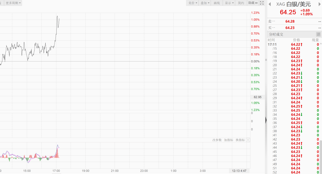 截至今日发稿,现货白银攀升至每盎司64.25美元,创历史新高。现货黄金向上涨超4300美元,为10月21日以来首次,日内上涨0.75%。