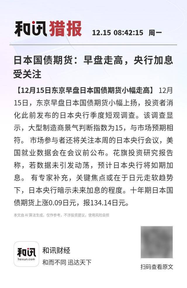 【12月15日东京早盘日本国债期货小幅走高】12月15日,东京早盘日本国债期货小幅上扬,投资者消化此前发布的日本央行季度短观调查。该调查显示,大型制造商景气判断指数为15,与市场预期相符。市场参与者还将关注本周的日本央行会议,美国就业数据会在会议前公布。花旗投资研究报告称,若数据未引发动荡,预计日本央行将如期加息。有专家补充,关键焦点或在于日元走软趋势下,日本央行暗示未来加息的程度。十年期日本国债期货上涨0.09日元,报134.14日元。