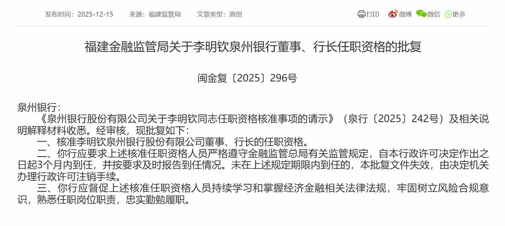 12月15日,国家金融监督管理总局福建监管局发布公告,核准李明钦泉州银行股份有限公司董事、行长的任职资格。