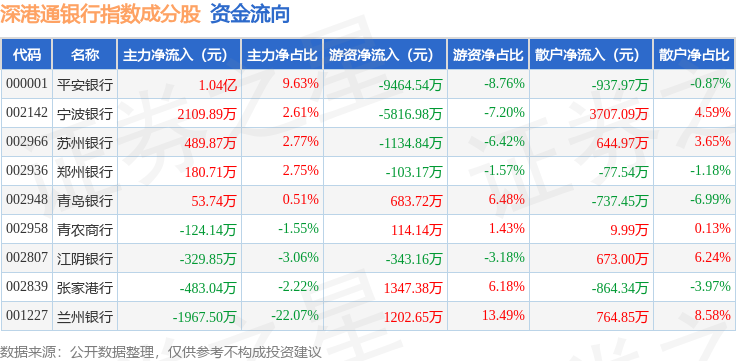 资金流向方面,深港通银行(983081)指数成份股当日主力资金净流入合计1.03亿元,游资资金净流出合计1.35亿元,散户资金净流入合计3182.6万元。成份股资金流向详情见下表: