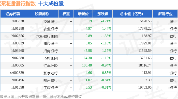 深港通银行(983081)指数十大成份股详情如下: