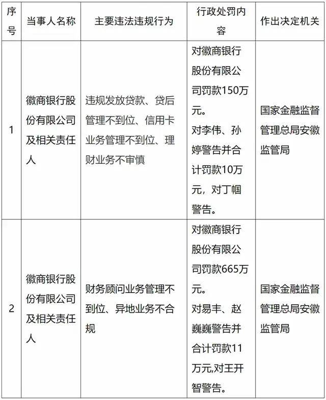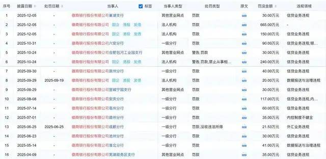 12 月 5 日,资产规模达 2.3 万亿元的徽商银行,因违规发放贷款、信用卡业务管理不到位等 6 项违法违规行为,被安徽监管局开出 815 万元大额罚单,4 名相关责任人合计被罚 21 万元。