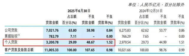 截至 2025 年 6 月末,该行个人贷款不良率为 1.52%,较年初上升 0.01 个百分点,高于整体不良率水平,反映出个人信贷业务的风险正在积累。